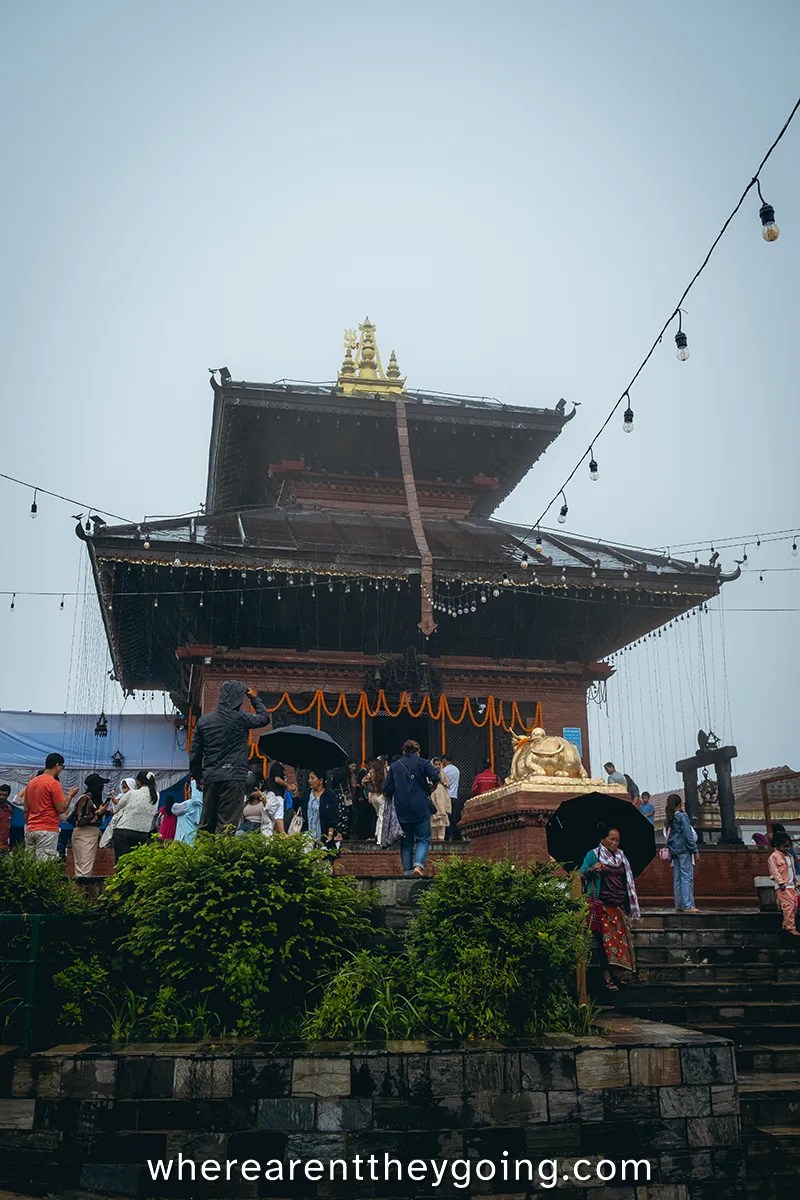 Since there was nothing else to see, we decided to at least check out the temple before heading down. Bhaleshwor Mahadev Temple is located on Chandragiri Hill, is dedicated to lord Shiva and is also a pilgrimage site. Itโs a pretty small temple, and I wouldnโt recommend coming here just for that. Of course, there are plenty of other activities at the top, like sky bikes, a cafe, and a restaurant, but we had other things planned for the day, so we threw in the towel and hoped to get a better view in Pokhara.