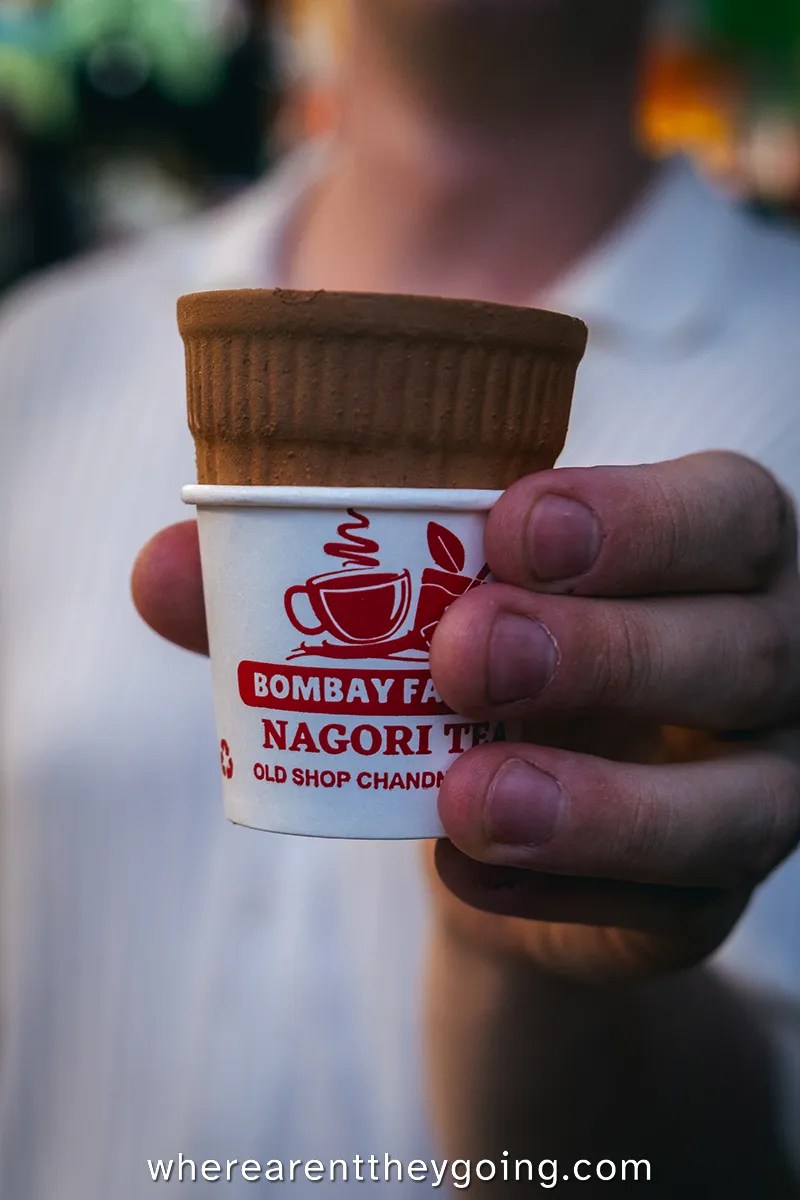 To take a break from eating, our guide took us to get a beverage. India is not a coffee-drinking country like the Western world, they usually reach for tea. This is what I was looking forward to the most. We had kullad chai, which is a standard milk chai served in a clay cup called a kullad. Chai is said to have lots of health benefits, such as reducing stress, helping with digestion, and more. Before serving, the kullad is rinsed with water and warmed with boiling water.