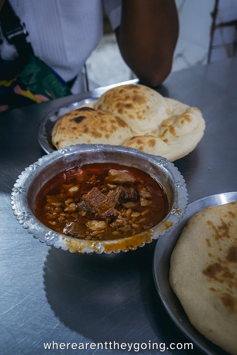 After finally making it to the other side of Old Delhi, we got out of the tuk-tuk and made our way into a small alley. This is the part of the food tour that felt the most Old Delhi local, a tiny hole in the wall deep into the city. There’s no way we could have found this on our own. Our guide served us nalli nihari, a spicy bone marrow stew with beef. The legend is that when the Mughal capital was relocated from Agra to Delhi, the army was not used to the colder weather and was getting sick during the winter. A general advised them to eat a hearty, spicy dish to combat the cold, and nalli nihari was born.