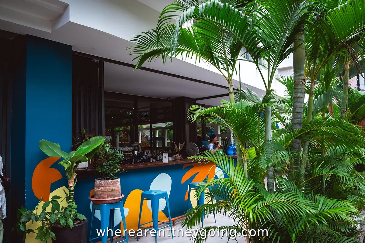 Originally, we werenโt planning on visiting Lot 369 Cafรฉ & Bar, but it was so hot that day, and we had already done everything we wanted to in Phnom Penh. A cup of specialty coffee sounded perfect. The cafรฉ is owned by Australians but run by Cambodians and is located near the Russian Market. Lot 369 can be a little tricky to find since itโs tucked away in a back alley, but just look out for their sign out front and head upstairs. The interior is open and airy, with wooden tables, lots of greenery, and vintage photos and furniture that give it a cozy, laid-back vibe.