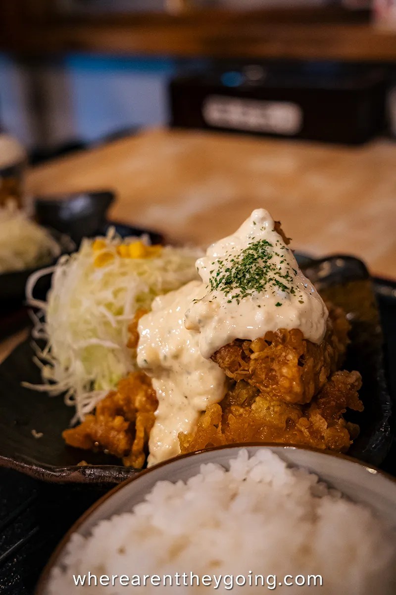 Just before we left the village, we wanted to try out one more regional dish: chicken nanban. This is a popular food all over Japan that comes from Miyazaki prefecture, where Takachiho is located. It is a simple deep-fried chicken with sweet and sour sauce, topped with tartar sauce. The original bar we wanted to visit was full, so we tried one of the other popular shops in Takachiho on a whim. Our first impression was good, the chicken was cooked well and the combination of tartar sauce was pleasant.