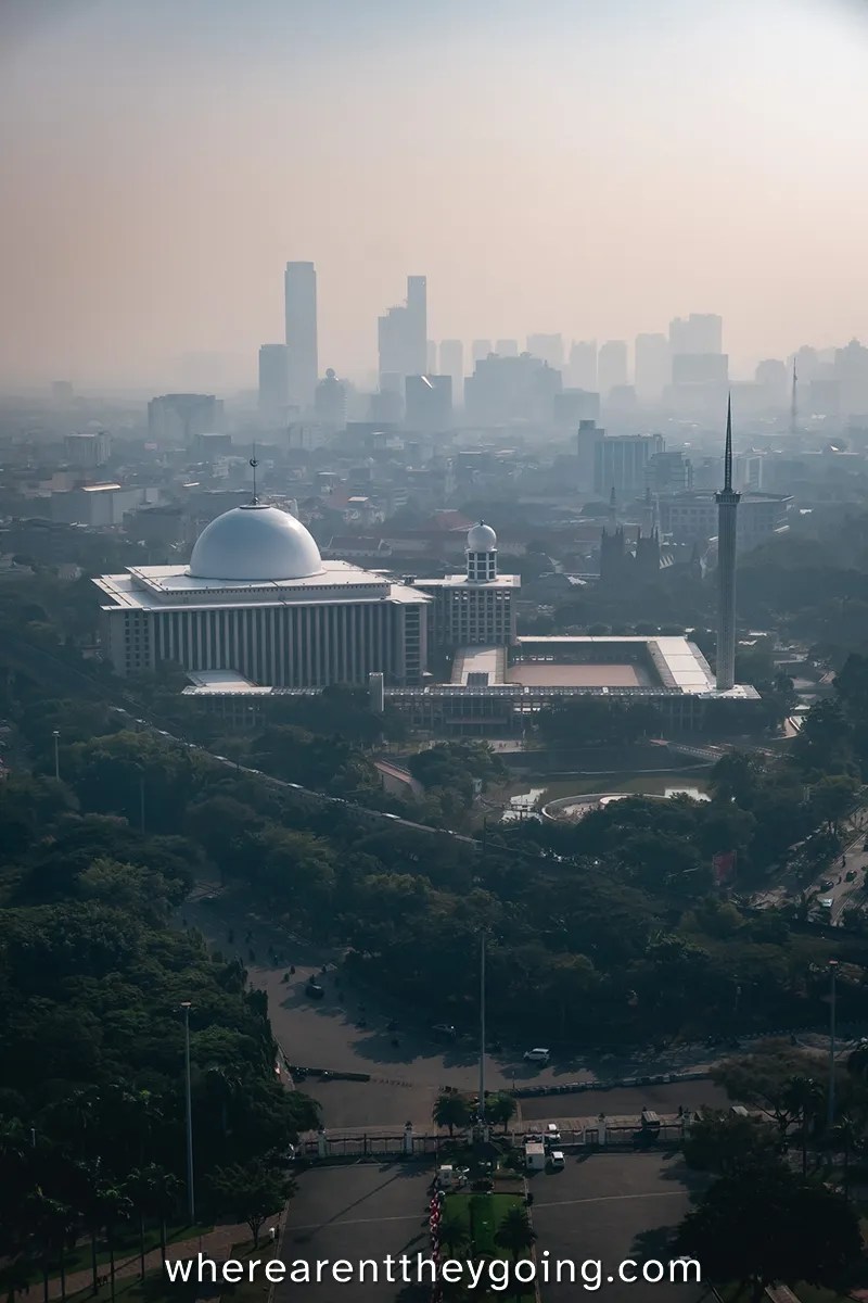 When the time came, we made our way to the tower and took the first elevator up. The view was incredible, since there are no skyscrapers around the square. From the top of the monument, you can see the Istiqlal Mosque and the cathedral next door with an amazing view. To be perfectly honest, the city does not have a very distinct skyline, and the smog was very severe, so it was not the best view weโve experienced. Regardless, we still consider the visit from the tower worth it, especially on clear days.